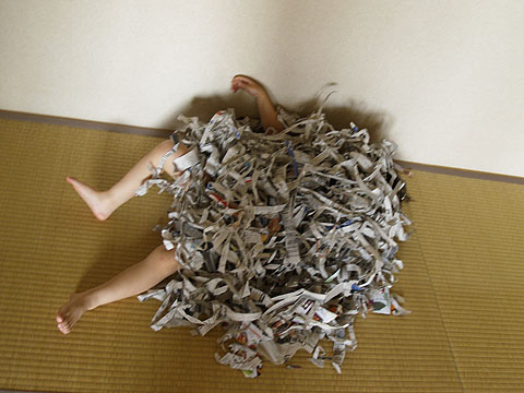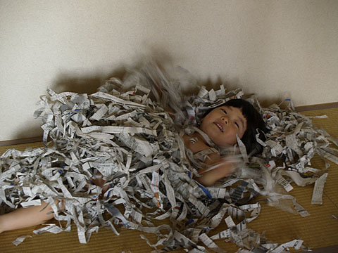 幼稚園でやったらしい新聞遊びをおうちでもやりたいと太郎。
